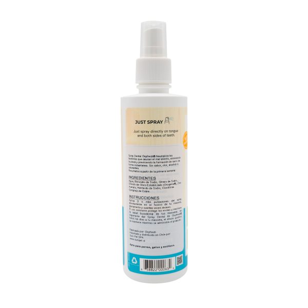 Spray dental de tamaño XL (rinde más). Sin necesidad de cepillado, rocíe directamente en el hocico de su mascota diariamente las veces que desees. Con Oxygene®, que neutraliza las bacterias causantes del mal aliento. Apto para perros, gatos y exóticos. Sin sabor, color, olor ni alcohol.
