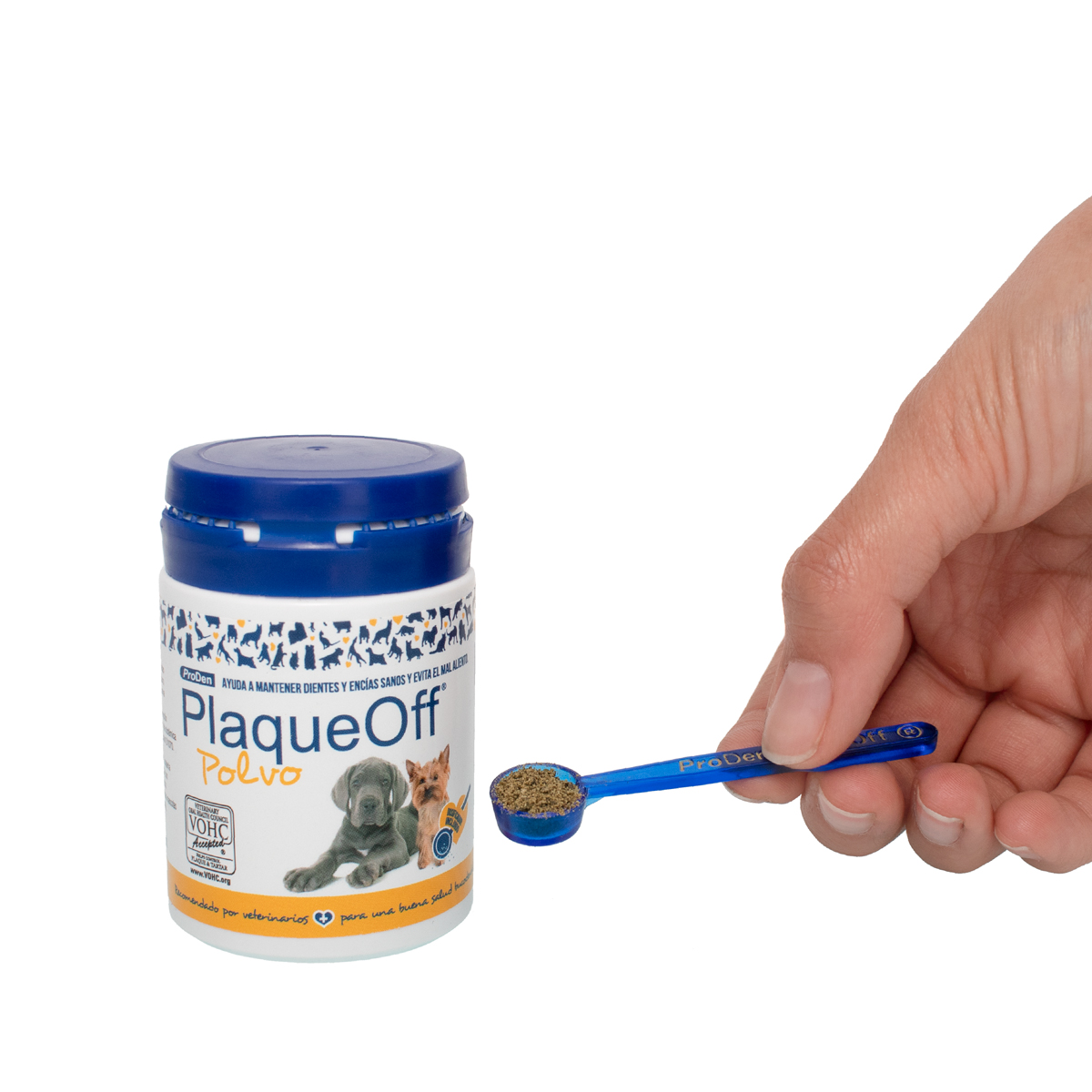 Espolvorea PlaqueOff® directamente en su comida. Incluye scoop dosificador en el envase.